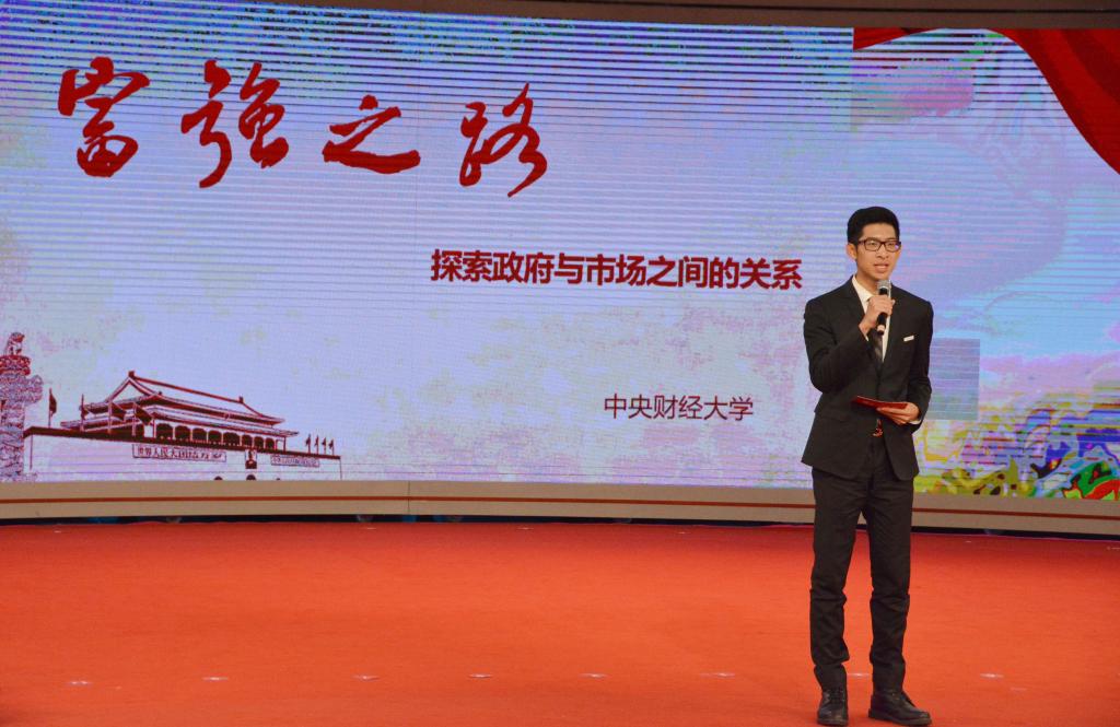 随后,在“学生团队思政课教学展示”环节,12所高校的同学们以饱满的情感和生动的形式,讲述新时代90后青年的理想、追求与深思。我校选送的作品是《富强之路:探索政府与市场之间的关系》。在伟德国际1946刘刚老师指导下,该团队由2015级本科生张荣臻、高天辰、温文、张弛等四位同学组成,其中张荣臻担任主讲。张荣臻同学从中国社会主义市场经济发展史的角度,来理解十九大报告中关于加快完善现代市场体系的同时,要处理好政府政策实施与市场自主运行之间的关系。张荣臻的展示说理透彻、充满自信,展现了中财学子的理论水平和精神风貌。