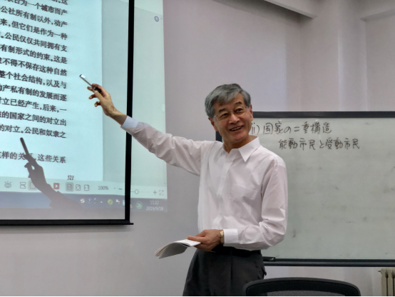 渡边宪正教授分八讲为大家分享了自己关于青年马克思理论研究的最新成果,第一讲从“马克思对费尔巴哈的继承与批判”谈起,渡边教授首先介绍了《德意志意识形态》online版的最新情况,作为MEGAII的重要组成部分,已于今年八月面向世界免费公开。渡边教授基于详实的文本考证指出,费尔巴哈把凌驾在人之上的理性、意志、爱的结合看作人的类本质,认为神是人的类本质的外化,但并未解释为什么神和人是对立的。马克思批判继承了费尔巴哈的思想,追求把普遍的政治要素归功于所有人。第二讲“再论青年马克思的理论转变”中,渡边教授从马克思追求政治解放引出了对民主制的解读,重点为大家解读了“民主制国家是基督教的人的基础”这一论断,基督教既有“公的要素”又有“私的要素”,两者无法协调,民主制国家是“政治的国度”和以私人权益为基础的“市民社会”的统一,因而民主制之中内涵了两种因素的矛盾。继而,渡边先生提出马克思对“市民社会”本身提出了批判,马克思发现,要实现人的解放必须对市民社会进行变革。
