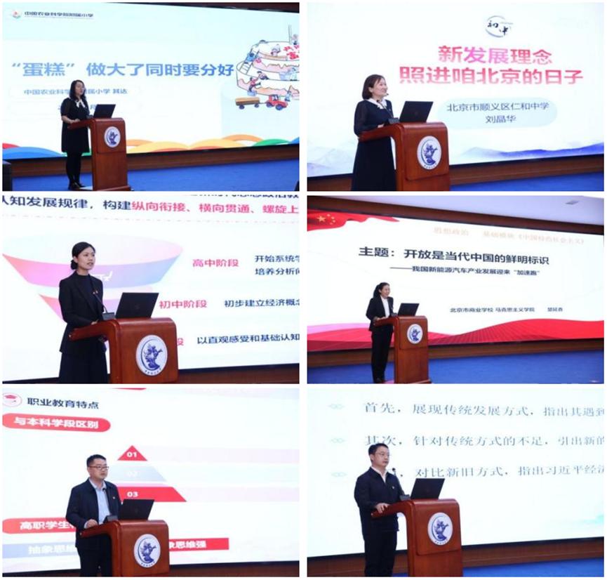 中国农业科学院附属小学其达、北京市顺义区仁和中学初中教师刘晶华、北京市第三十五中学高中教师邵月玲、北京市商业学校伟德国际1946教师楚延香、北京经济管理职业学院伟德国际1946教师姚昊炜、伟德国际1946教师李扬等六位思政课老师,展示了习近平经济思想融入各学段的教学设计。