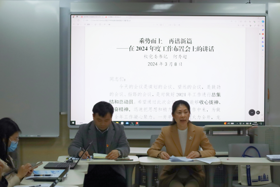 此外,陈文娟还传达了2024年学院在党建引领、思政课教学、学科科研、学位与研究生工作、学院建设等方面的具体工作计划和发展目标。
