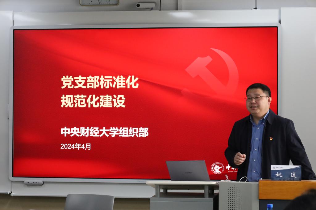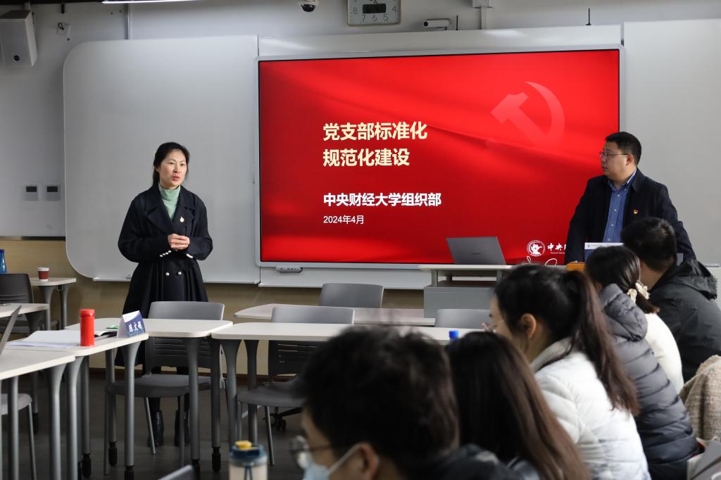 2024年4月10日下午在10号学院楼317教室,组织部姚逍副部长为我院党务工作者进行党支部标准化规范化建设专题培训,培训由学院党委书记陈文娟主持,党委副书记徐芳,全院党支部书记及支委参加了会议。