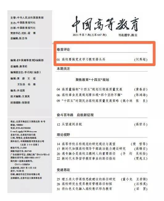 近日,我校党委书记何秀超在最新一期的《中国高等教育》上发表署名文章《高校要做党史学习教育排头兵》。文章指出,高校是培养社会主义建设者和接班人的摇篮,深入学习、研究和运用党史,充分发挥党史以史鉴今、资政育人的作用,是高校的崇高使命和重大责任。文章从提高政治站位、提高干事创业凝聚力、做“学史明理、学史增信、学史崇德、学史力行”的排头兵三个方面,就高校如何切实担当起党史学习教育排头兵提出了思路和路径。