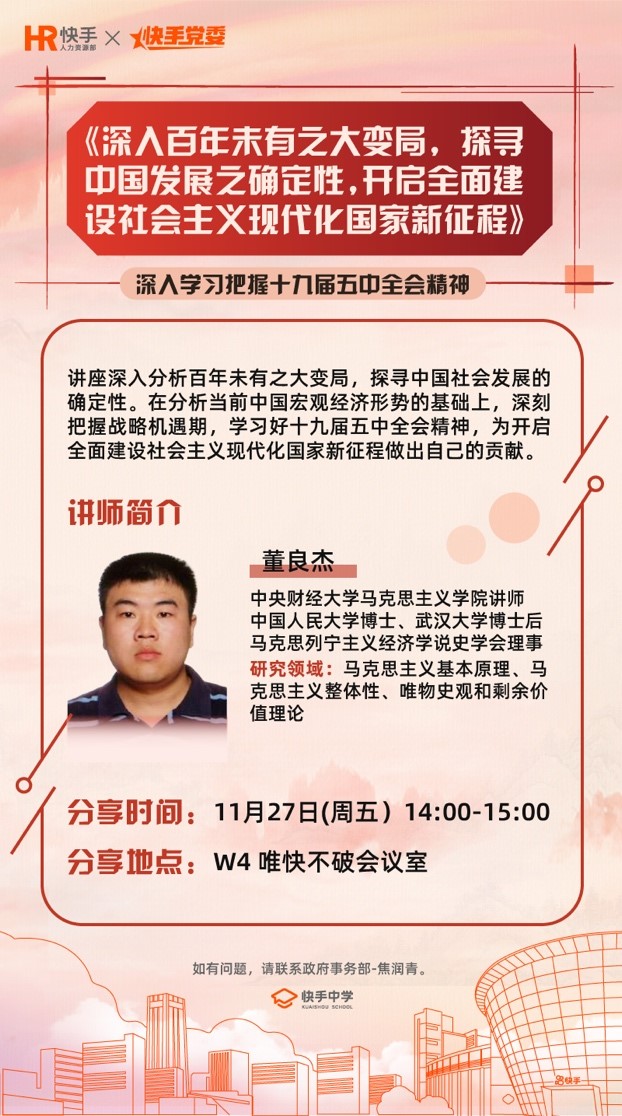 大变局中把握时代机遇,确定性中探寻百年征程。近日,快手党委联合共建单位伟德国际1946开展“深入百年未有之大变局,探寻中国发展之确定性,开启全面建设社会主义现代化国家新征程”主题讲座。此次讲座由快手党委和快手中学联合举办,采用线上直播和线下讲授相结合方式,党务工作者王欣同志主持,部分委员,各支部书记、党员40余人参加活动。