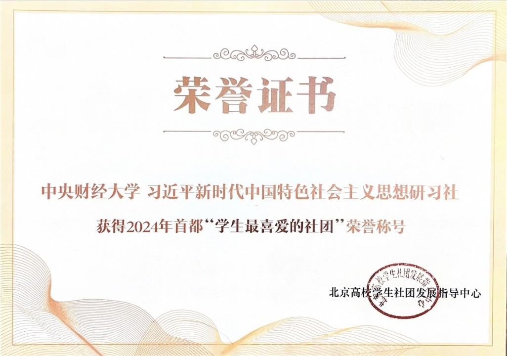 为深入学习宣传贯彻党的二十大和二十届三中全会精神,坚持不懈以习近平新时代中国特色社会主义思想铸魂育人,全面贯彻落实习近平总书记关于高校思想政治工作和青年工作的重要论述,切实发挥学校社团活动育人、实践育人、服务育人、管理育人等职能,塑造积极向上、活力阳光的校园文化氛围,在庆祝中华人民共和国成立75周年之际,团市委、市委教育工委、北京学联、北京高校学生社团发展指导中心等联合开展了2024年首都高校“学生最喜爱的社团”评选活动,我院“习近平新时代中国特色社会主义思想研习社”荣获2024年首都高校“学生最喜爱的社团”荣誉称号。