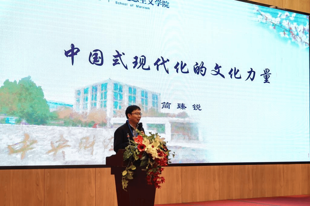 我院教师简臻锐副教授应邀参加本次活动,并作题为《中国式现代化的文化力量》专题报告。报告以中国式现代化的提出及其文化命题为导入,重点解答了如何从中国式现代化的“中国特色”探析其所蕴含的文化力量,主要包括以下五个方面:从理想信念看实现人口规模巨大现代化的文化引领力,从核心价值观看实现全体人民共同富裕的文化凝聚力,从中国精神看推动物质文明与精神文明协调发展的文化内生力,从整体观念看促进人与自然和谐共生的文化涵养力,从道德追求看坚定不移走和平发展道路的文化包容力。