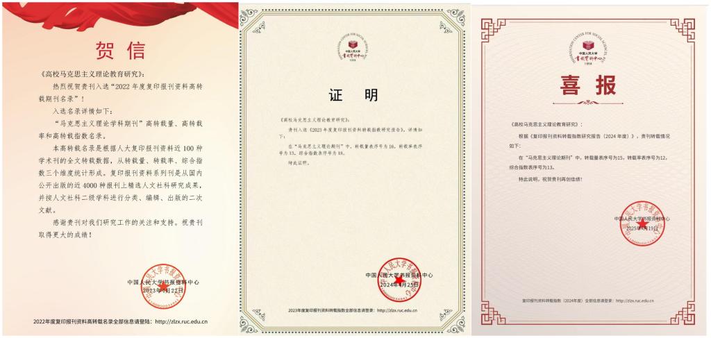 自2020年12月创刊以来,《高校马克思主义理论教育研究》依托我校马克思主义理论学科优势,不断优化编审体系、提升论文编审质量,提高刊发论文的社会影响力和学术影响力。连续4年入选中国人民大学复印报刊资料“马克思主义理论学科期刊”高转载量、高转载率和高转载指数名录。